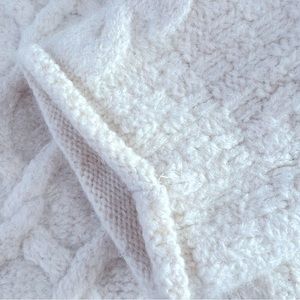 Preloved Condition, Cozy, thick, and beautifully warm, this authentic Inis Crafts turtleneck sweater is crafted from 100% merino wool in a natural/off-white shade. Features a classic Aran cable-knit pattern with a snug turtleneck—perfect for fall and winter.
