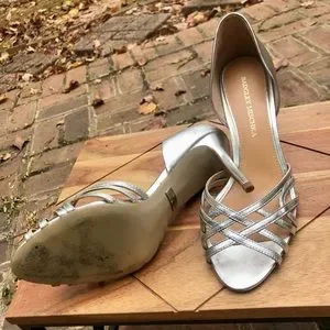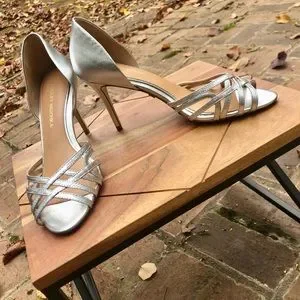 A beautiful pair of silver heels from designer Badgley Mischka, featuring an open toe front and a closed back for support. The stiletto heel is 3.5” and has a textured rubber tip for stability.