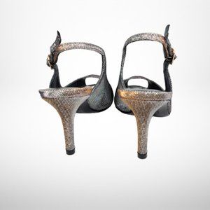Stuart Weitzman peep-toe slingback in iridescent glitter fabric. Peep-toe; single sole pump. Adjustable buckled slingback strap.