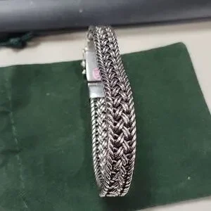 What we have here is a heavyweight stamped 925 Sterling Silver bracelet. Measure 8.5 inches long. New without tag. There is no brand name. Just stamped 925. Oxidated Beauty finish, adds character and depth to the intricate design,creating a rustic yet refined look. Have a Double clousure. Massive piece. Unisex. Design is a mix of weath and braided. Come with a pouch to store. weight 52 grams/1.85 Oz.