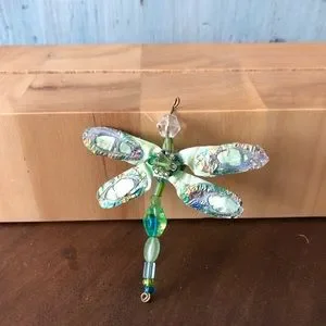 Beautiful artisan handmade dragonfly pendant with iridescent wings and beaded body. She is 2-3/4” long and her wingspan is 2-1/2” so she makes quite a statement. She’s very lightweight and easy to wear - just slip her on your favorite necklace and away you go!