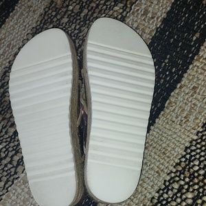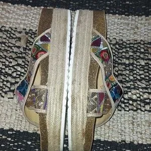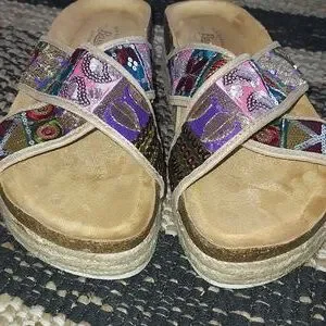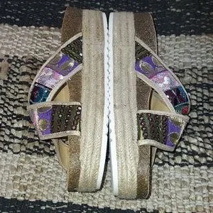 Size 9. Multicolored. 2". platform in the back. 1 1/4" front. contour footbed for comfort. NWOT. Slide on.