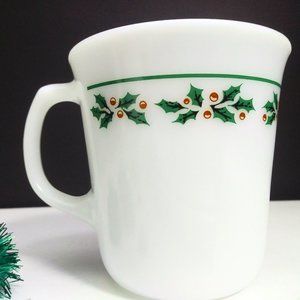 The pair is a vintage Pyrex Corning milk glass Christmas garland mug. To have hot cocoa, tea, coffee, a hot toddy or your favorite beverage while watching one the greatest movie of all time Holiday Inn.