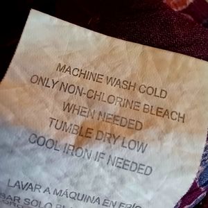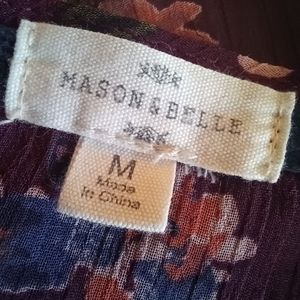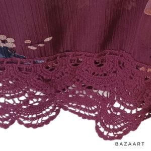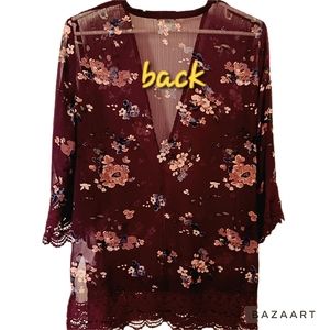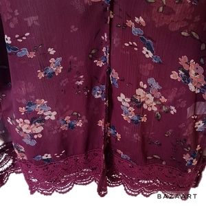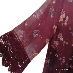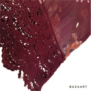 Open kimono-style lacey top by Anthropologie brand Mason & Belle. Beautiful deep burgundy color with softly muted floral print (photographed more red than it actually is). Crochet 4" lace trim at sleeves & hem. 3/4 sleeves, 9" side slits. Sheer lightweight 100% poly body, 100% cotton lace crochet. Machine wash & dry. Like new condition, no signs of wash or wear, no flaws noted. Approximate measurements: