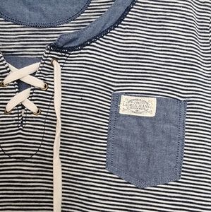 Lauren Jeans blue and white stripe short sleeve t-shirt with lace up front tie. Chest approximately 21 inches laying flat pit to pit. Gently worn in good condition from non-smoking home.