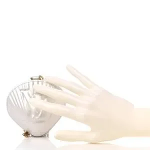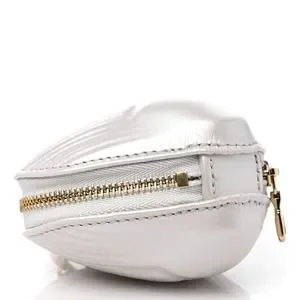 • This coin purse is crafted from cowhide in the shape of a seashell with a white iridescent sheen. It features polished gold hardware, embossed with a trompe-l'œil scallop pattern on the front, and opens to a matching leather interior. This miniature shell can be hooked onto a bag or belt.