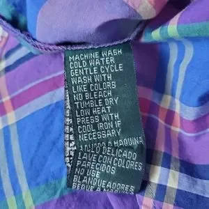 Vintage plaid button front shirt by Ralph Lauren in shades of purple, pink, blue & yellow. Beautiful eye catching colors! Long sleeve, LRL signature monogram front pocket. Excellent used condition, no stains or flaws that I can find. Made in Hong Kong of 100% cotton.