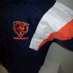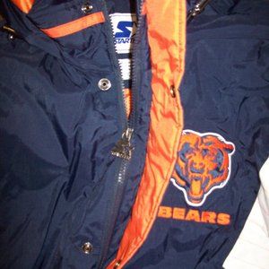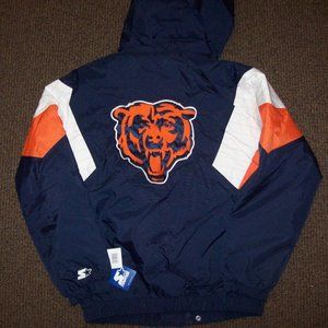Size: 5X BEARS Starter NFL Hooded Jacket. High quality Hooded Nylon Jacket . Hood is attached. The jacket's outside shell is Nylon and the inside lining is soft polyester. Full Zip Jacket with snap down. The "BEARS" Logo & Lettering is meticulously sewn on. New STARTER 2020. Color: BLUE with ORANGE & WHITE Trim Satisfaction guaranteed or return. Measurements: 3X: 29, 4X: 31" 5X: 33" 6X: 35" This is a Medium weight Winter Jacket that flows with your body. Jacket has 2 outer pockets