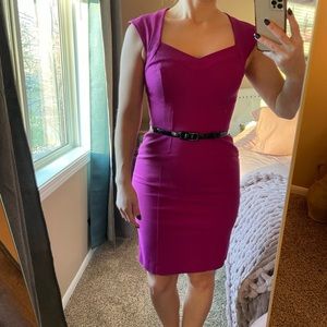 White House Black Market berry bodycon with matching black belt. Well loved, no damage. Size 0. Lined throughout. Matching belt included. Open to offers!