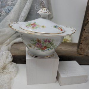 A vintage Monarch China Sunny Vale lidded sugar bowl from Occupied Japan. Its delicate floral design and gold trim add an elegant touch to any table setting.