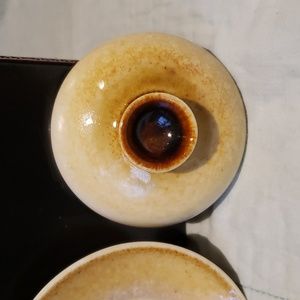 Asian teacup in tan and brown with Asian writing.