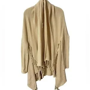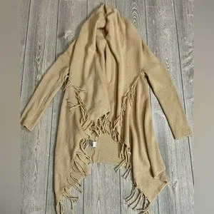 Cream/Tan color Long Duster with Fringe, Open front Cardigan, Size Small