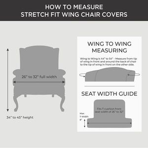 Fits most T-cushion wing chairs 34" to 45" tall and 26” to 32” seat width (measured across front)