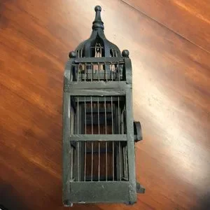 Large, stunning vintage Victorian or Taj Mahal style birdcage structured from wood and wire. Semi hidden panel opens along the bottom to reveal access to the inside - slides out so that you can add little birds and / or nests and faux greenery. (See photo #5.)