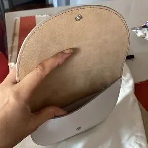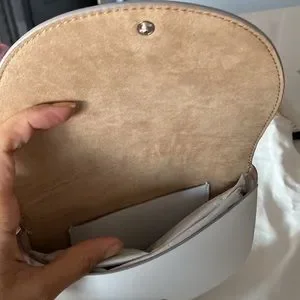 Button closure on both sides, each side comes with a pocket for cards. You can hold it with the silver round handle or a cross body strap (which has silver hardware but the strap is the same color/material as the purse).