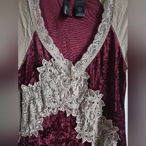 Gorgeous velvet top with lace embellishment. A show stopper that's perfect for the holiday season! Excellent condition! Like new, only worn once as it is unfortunately, a little too small for me. My loss can be your gain! No holes, stains, or tears. Pet and smoke-free home.