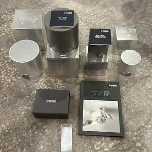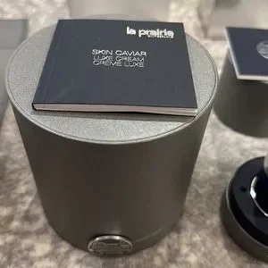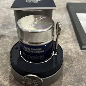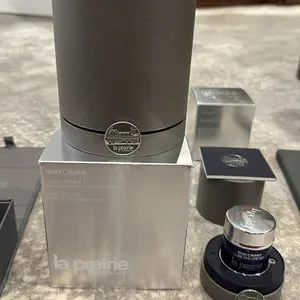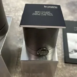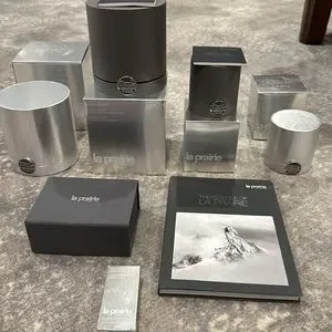 LA PRAIRIE SKIN CAVIER EMPTY LARGE GLASS CONTAINER WITH SPATULA IN ALL ITS BOXES WITH ITS BOOK 2. SKIN CAVIAR EYE CREAM GLASS CONTAINER WITH SPATULA IN ALL ITS BOXES WITH BOOK 1 BOX WITH 5 SAMPLE SIZE GLASS BOTTLES EMPTY. 1 BOUND BOOK AND ONE TUBE FULL OF CAVIAR ESSENCE SAMPLE FOR FREE AT ASKING PRICE 2 OLDER SILVER TUBES AND BOXES IF U LIKE THAT COLOR MORE THEN THE NEW DARKER SILVER