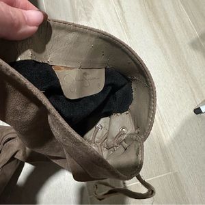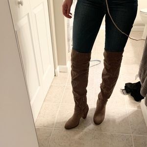 Some light wear! Jessica Simpson Coriee microsuede over the knee boots in taupe color. Some markings on boots and faux suede. Ties on back on leg starting to peel, but still tie! Can also just replace the laces. Inside lining at top starting to crack and peel. Heel height about 3.75”, about 14” circumference, and 24” boot height.