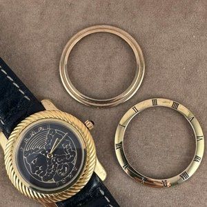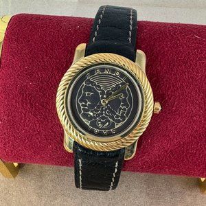 Fendi 1925 Roman Coin Watch Reverse marked FENDI 800G Dark Brown Face features the God Janus; the mythical God of beginnings and endings. Registered Number 000-221 Swiss Made water resistant 100 ft 18K Heavy 20 Micron Gold Plating, Rolled Rope Bezel (comes with Plain Gold and Roman Numeral Bezels) Case is 1 5/16 inch diameter 1.5 inch lug to lug, Black Onyx Crown Gold Hands, Crystal does show very very light scuffs under 3.5 power magnification Case is in almost perfect condition and comes with 2 extra bezels.New 9 inch Black Stitched Leather Strap Bracelet is in very good condition UNISEX in Size. Fendi Roman Coin Watch Fendi 1925 Roman Watch with Box