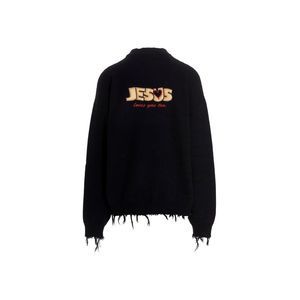 'Jesus Loves' merino wool sweater with embroidery at the front and back, crew neck, long cuffed sleeves, frayed trims.g.