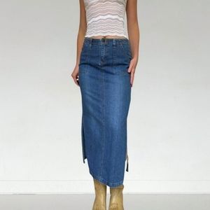 Early 00s Union Bay low rise mid washed denim skirt. Micro pinstripe pattern, double side slits. Somewhere between midi and maxi length.
