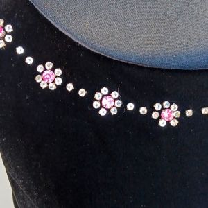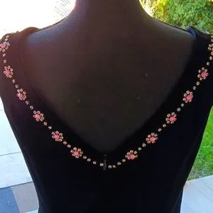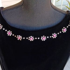 Jessica Howard vintage black maxi velveteen evening dress with pink and clear rhinestones, size 10. Top portion is lined. Material has stretch, 90% polyester, 10% spandex. Measures 17.5" armpit to armpit flat across. Length is approximately 49" from mid-back. 57.5" from shoulder. Pre-owned, very good condition, only wore once.