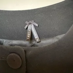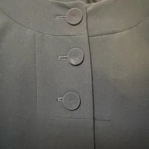 Slightly cropped jacket with rear box pleat falling from a short back yoke. Button tab detail on the back. This jacket is slightly trapeze shape and the box pleat gives it a little more volume for a nice, swingy shape. Fabric-covered buttons, 3 in front and 2 on back tab.