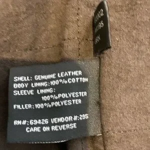 Outer shell 100% genuine brown leather, excellent condition. Polyester lining, 4 outer zip pockets, 2 inside button pockets.