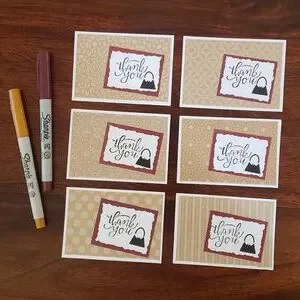 15 coordinating handmade (by me!) cards are neutral colored with burgundy accent, cut out purse silhouette and hand-stamped with "thank you". 4" x 2.75" A bit larger than a business card, so there's room to jot down a personal note, but also works without.
