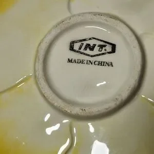 INT. Yellow Violet Flower Shaped Trinket Dish. Measures approximately 5-3/4" across x 1/2" tall. No chips, cracks or flaws. Smoke free home.
