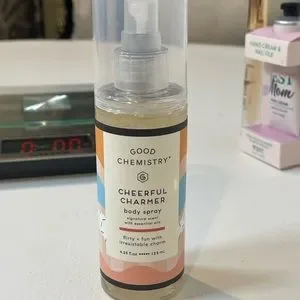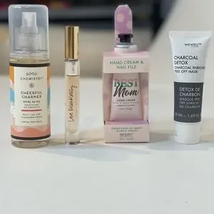 Tory Burch Roll on Perfume (used a couple of times), Charcoal Peel Off Mask (New, Sealed), Hand Cream & Nail File (New), Good Chemistry Cheerful Charmer Body Spray. See pictures for detailed descriptions. (2025-253)
