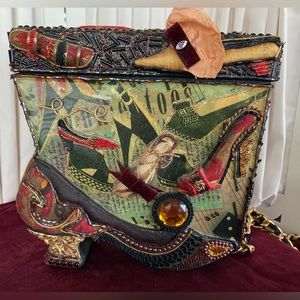 This is a prize and an incredible gift. A multicolor vintage ‘60s era Mary Frances crossbody papier-mâché (box) bag. In great shape. Only blemish to note is a small scuff on bottom of shoe-shaped purse. See photos. She is a beauty.