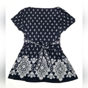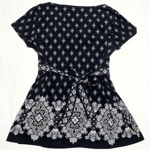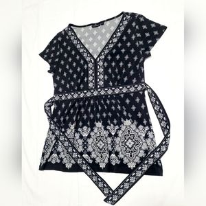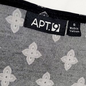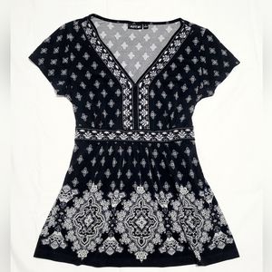 APT. 9 Women's Size Small Blouse Top Geometric Print V-neck Flared Shirt Black and White Short-Sleeve.