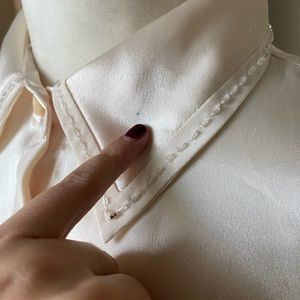 Beautiful staple piece for your wardrobe. Beading around collar. Small stain on left side of collar. I haven’t tried to remove the stain so it might come out.