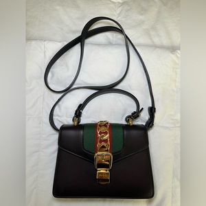 GUCCI SYLVIE TOP HANDLE BAG LEATHER MINI in Black with gold, red, & green detail