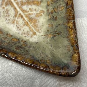 This is a ceramic studio art pottery glazed heart leaf print trinket dish tray. It is signed and stamped on the bottom. It features earthy brown, gray, blue and cream tones with a shiny glaze finish. The veins of the leaf print give it a nice texture. It would be great for jewelry on your bedroom dresser or nightstand. It would also be good to use at your office desk for paper clips and other small items. This is in excellent condition.