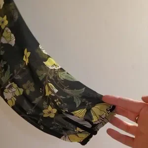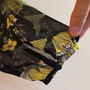 Long sleeve dress with sheer floral overlayer. Solid black underlayer. Sleeves are sheer, with buttons at the cuff.