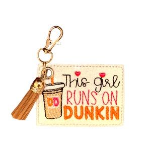 NEW Embroidered “This Girl Runs On DUNKIN” Coffee Faux Leather Keychain