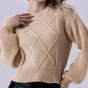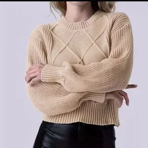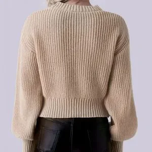 crew neck, long sleeves, puffy balloon style, shorter length Sweater, neutral beige cream color