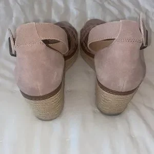 The details on these wedges are so cute! They are blush in color with a suede like material. They feature a floral eyelet detail on the top band with scallop edges. They have a 1.5 inch platform and a 3 inch wedge heel.