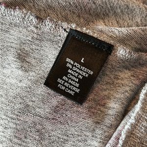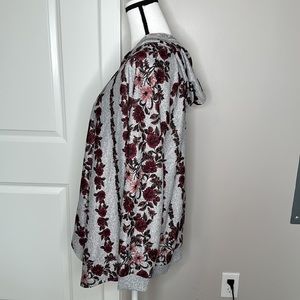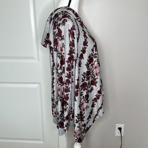 NWOT DB (Dressbarn) Sunday cardigan hoodie. Gray background with burgundy and pink flower print. No closure, long sleeves, draping front. Size L. 95% polyester and 5% spandex. Approximate measurements- armpit to armpit- 21 inches, length- 27 (shortest length, is variable).