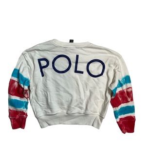 This terry crop sweatshirt features a logo at the chest, a "polo" logo at the back, and colorful tie-dye drop-shoulder sleeves.