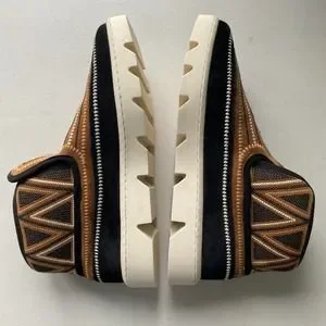 Cream soles, Black, Brown, Tan triangular geometric embroidered pattern.