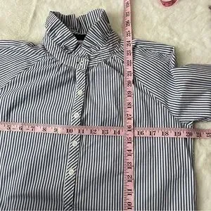 Blue and white stripe half button down long sleeve blouse by Vineyard Vines. Excellent preowned condition other than one tiny stain (see photos). Size 8.