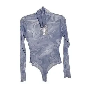 Naked Wardrobe Bodysuit Turtleneck Mesh Long Sleeve Denim Marble Size Small