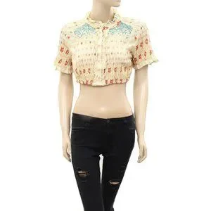 Free People Ditsy Floral Printed Cropped Top Ruffle Beige Buttondown S