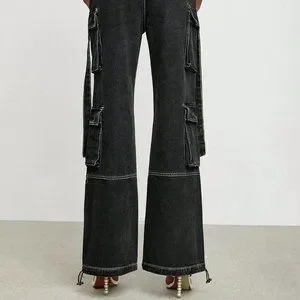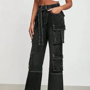 Black Casual Womens Flap Pocket Belted Cargo Jeans