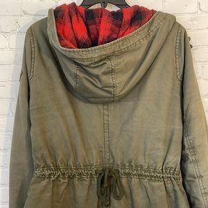 Hollister Olive Green with Buffalo plaid lining warm weather Parker Coat Jacket