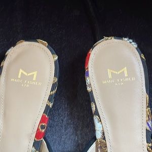 Marc Fisher Shiloh 4 Black with Gold and Red,purple floral embroidered slip on mules. Like new condition. Received by my daughter like a gift, never been worn. Very beautiful in person.