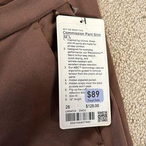 Lululemon Commission Pant Slim 28 x 32 NWT Brown